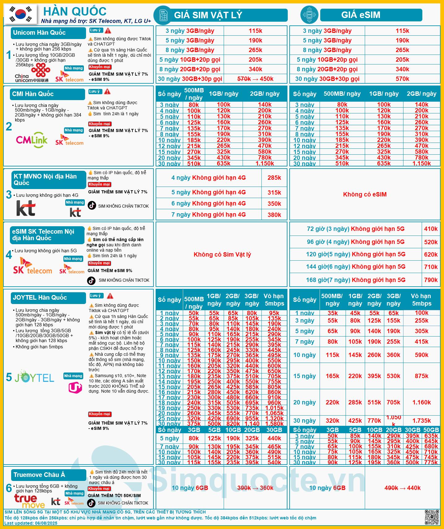 Bảng Tổng Hợp Sim và eSIM Hàn Quốc